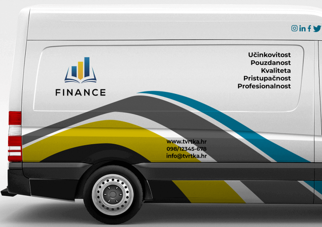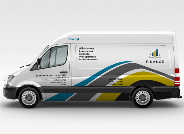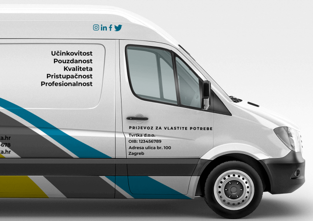 Komplet naljepnica za bočne strane kombi vozila (L i D). Prilagoditi se mogu elementi: lista benefita, logo, osnovni podaci tvrtke i kontakt podaci. Montaža je kompleksna pa predlažemo da je povjeriš nama.