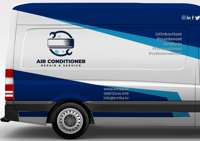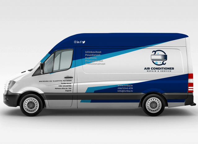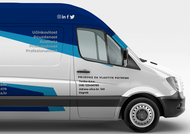 Komplet naljepnica za bočne strane kombi vozila (L i D). Prilagoditi se mogu elementi: lista benefita, logo, osnovni podaci tvrtke i kontakt podaci. Montaža je kompleksna pa predlažemo da je povjeriš nama.