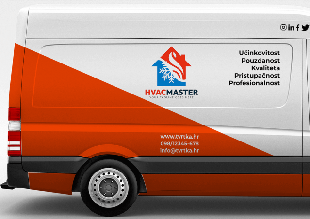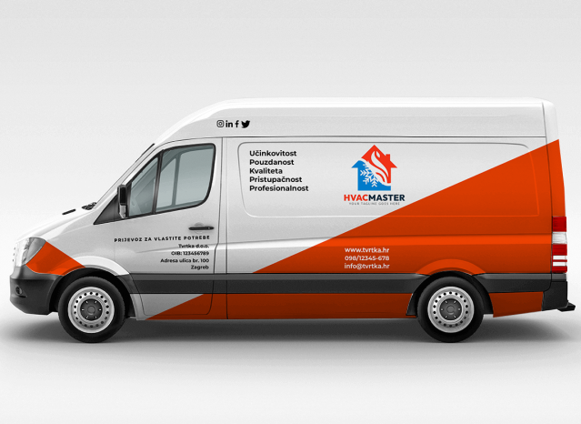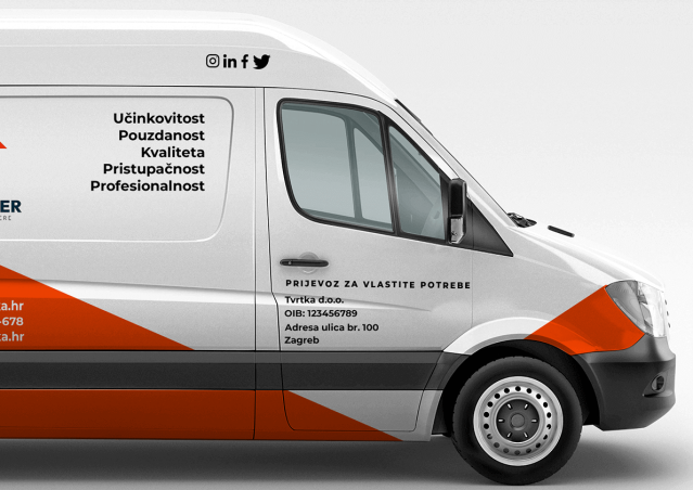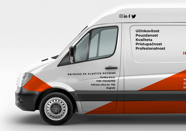 Komplet naljepnica za bočne strane kombi vozila (L i D). Prilagoditi se mogu elementi: lista benefita, logo, osnovni podaci tvrtke i kontakt podaci. Montaža je kompleksna pa predlažemo da je povjeriš nama.