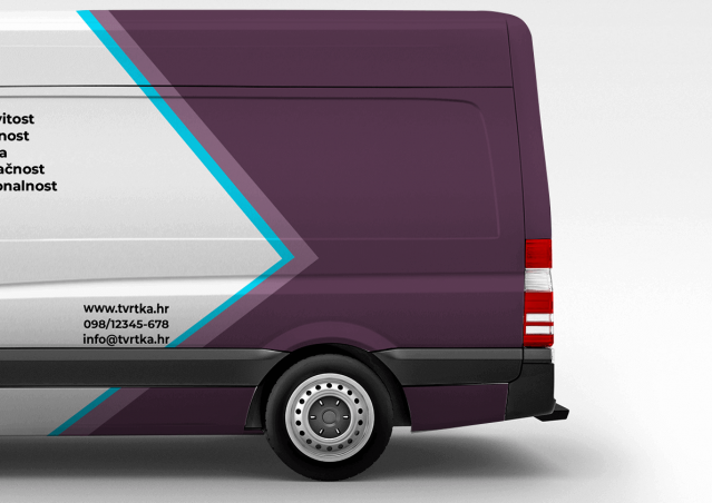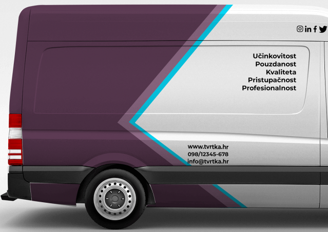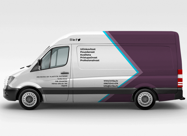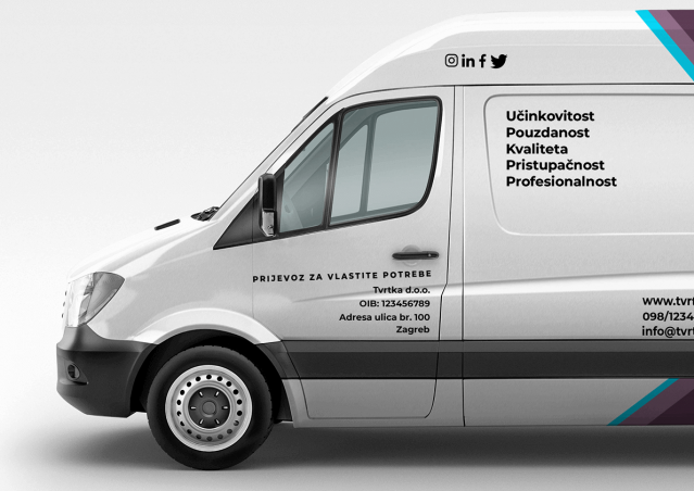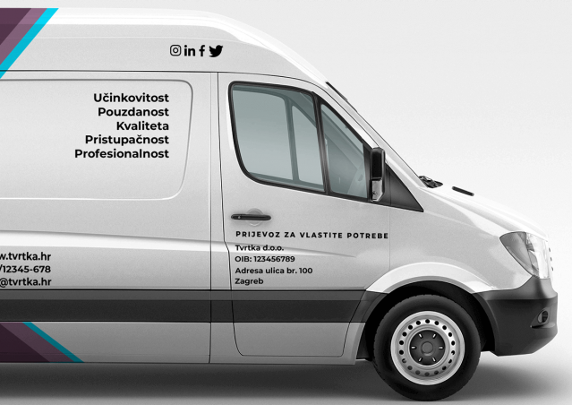 Komplet naljepnica za bočne strane kombi vozila (L i D). Prilagoditi se mogu elementi: lista benefita, logo, osnovni podaci tvrtke i kontakt podaci. Montaža je kompleksna pa predlažemo da je povjeriš nama.