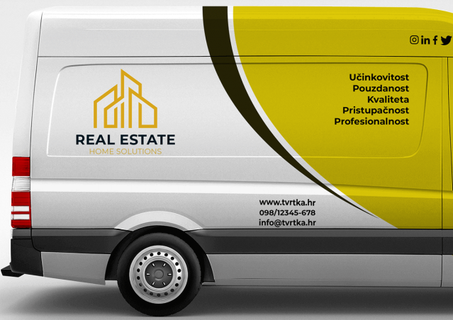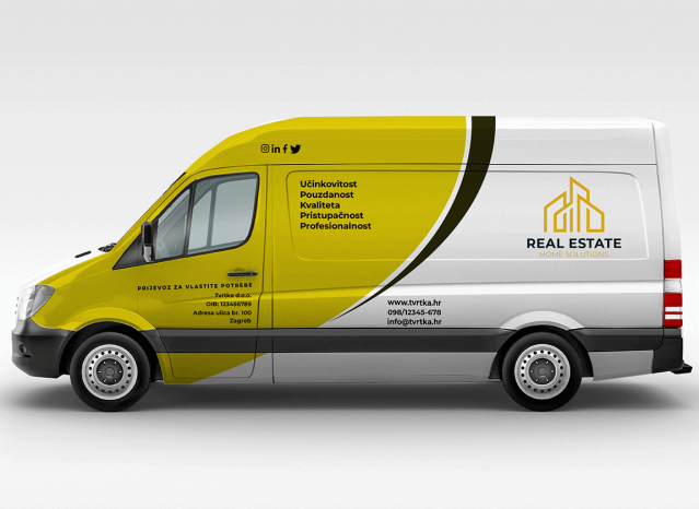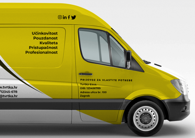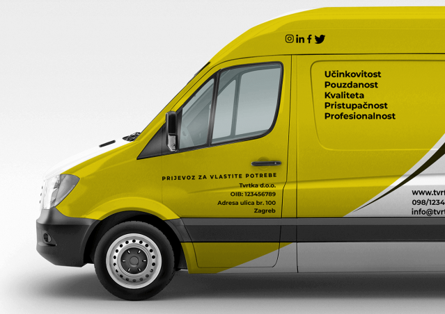 Komplet naljepnica za bočne strane kombi vozila (L i D). Prilagoditi se mogu elementi: lista benefita, logo, osnovni podaci tvrtke i kontakt podaci. Montaža je kompleksna pa predlažemo da je povjeriš nama.