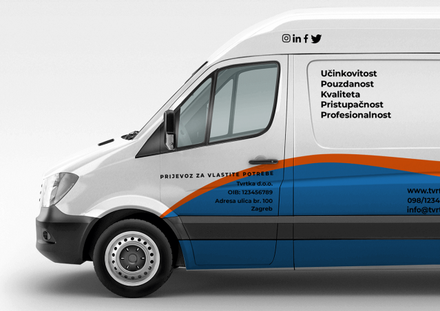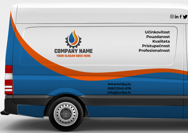 Komplet naljepnica za bočne strane kombi vozila (L i D). Prilagoditi se mogu elementi: lista benefita, logo, osnovni podaci tvrtke i kontakt podaci. Montaža je kompleksna pa predlažemo da je povjeriš nama.
