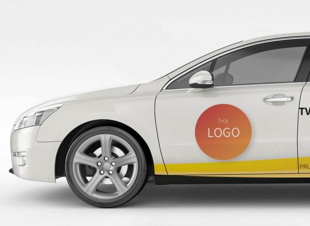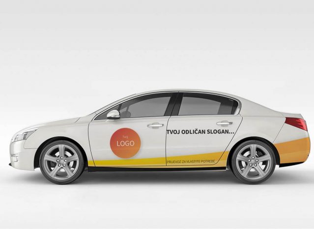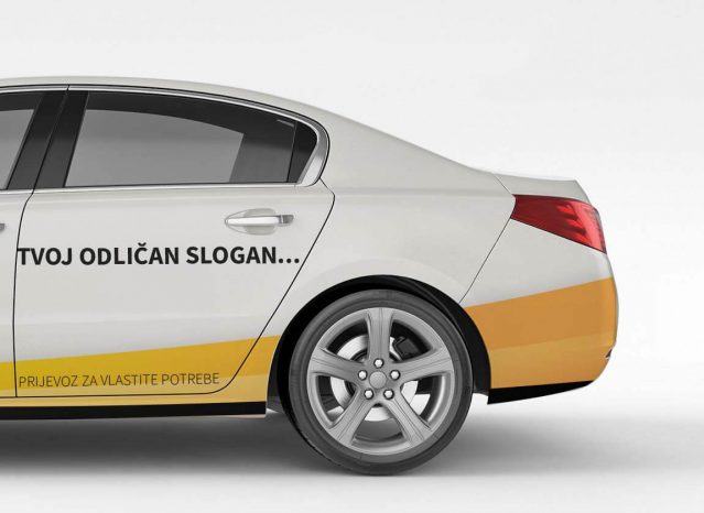 Komplet naljepnica za bočne strane osobnog vozila (L i D) sa 75% oslikanosti, s logom tvoje tvrtke i sloganom.  Montaža ovih naljepnica je kompleksna pa predlažemo da odabereš i naše usluge stručnog postavljanja na vozilo.