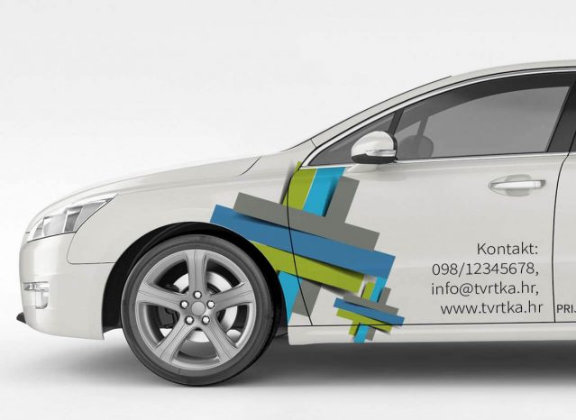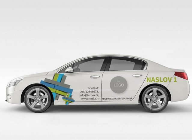 Komplet naljepnica za bočne strane osobnog vozila (L i D) sa 75% oslikanosti, s logom tvoje tvrtke, sloganom i kontakt podacima.  Montaža ovih naljepnica je kompleksna pa predlažemo da odabereš i naše usluge stručnog postavljanja na vozilo.