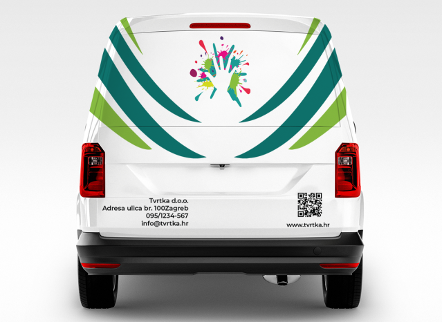 - Pozadinska grafika – pozicionira se na teretnom dijelu vozila. Sjajan efekt se dobiva uvećanjem pojedinih elemenata logotipa ili pozadinskom fotografijom povezanom s tvojom djelatnosti.