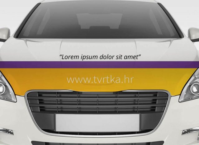 Naljepnica za poklopac motora osobnog vozila s color tekstualnim elementom i web adresom tvrtke. Montaža je kompleksnija pa je možeš povjeriti nama.