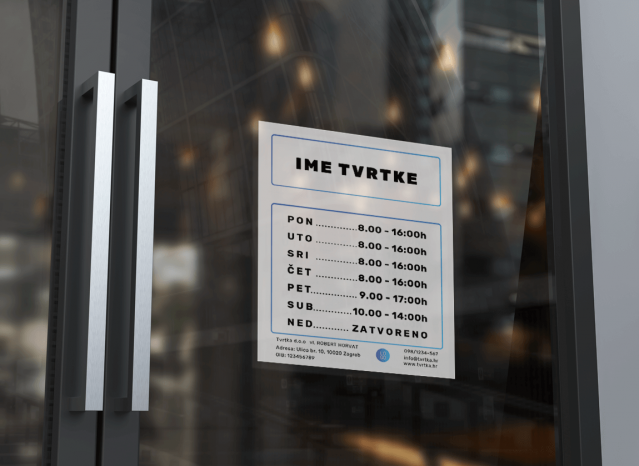 Naljepnica za izlog s prikazom radnog vremena i osnovnih podataka tvrtke ili obrta. Dimenzije naljepnice su cca 150×210 mm (A5 format), a montaža je jednostavna te je možeš obaviti samostalno.