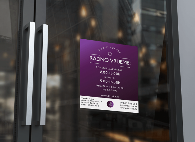 Naljepnica za izlog s prikazom radnog vremena i osnovnih podataka tvrtke ili obrta. Dimenzije naljepnice su cca 150×210 mm (A5 format), a montaža je jednostavna te je možeš obaviti samostalno.