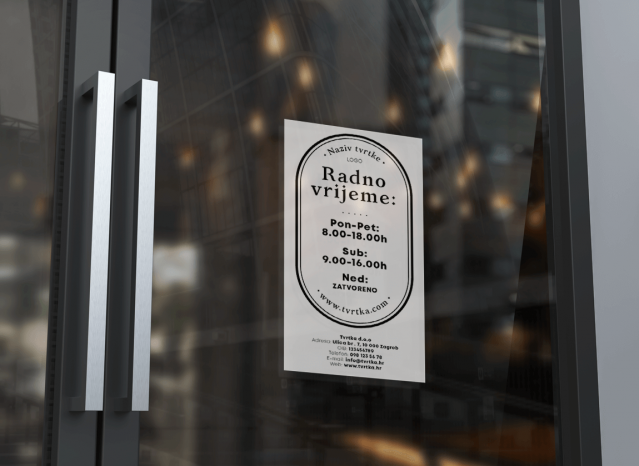 Naljepnica za izlog s prikazom radnog vremena i osnovnih podataka tvrtke ili obrta. Dimenzije naljepnice su cca 150×210 mm (A5 format), a montaža je jednostavna te je možeš obaviti samostalno.