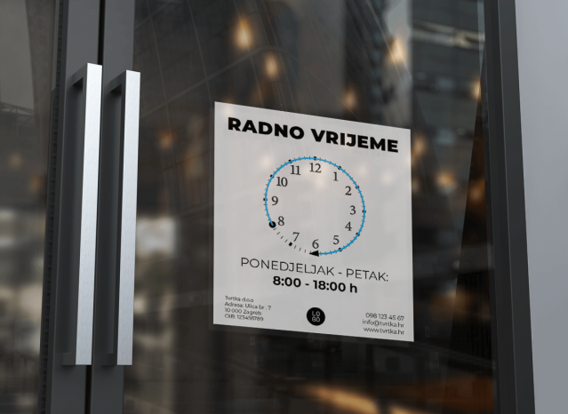 Naljepnica za izlog s prikazom radnog vremena i osnovnih podataka tvrtke ili obrta. Dimenzije naljepnice su cca 150×210 mm (A5 format), a montaža je jednostavna te je možeš obaviti samostalno.