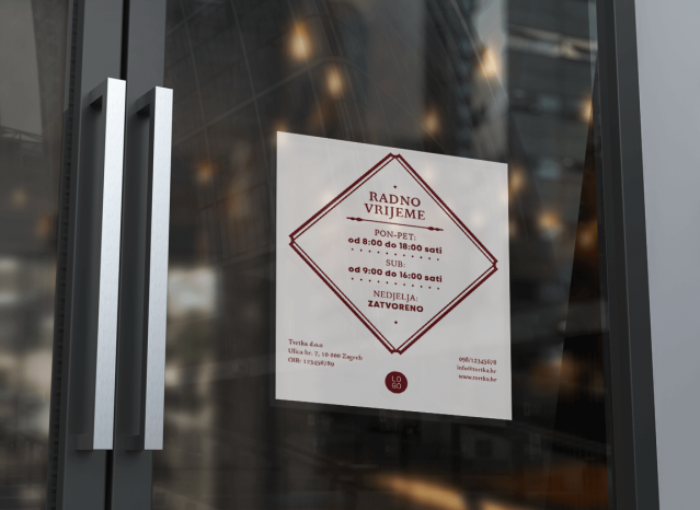 Naljepnica za izlog s prikazom radnog vremena i osnovnih podataka tvrtke ili obrta. Dimenzije naljepnice su cca 150×210 mm (A5 format), a montaža je jednostavna te je možeš obaviti samostalno.
