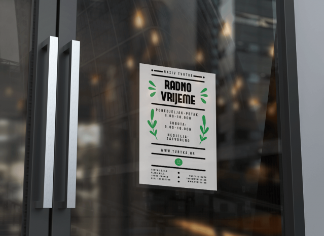 Naljepnica za izlog s prikazom radnog vremena i osnovnih podataka tvrtke ili obrta. Dimenzije naljepnice su cca 150×210 mm (A5 format), a montaža je jednostavna te je možeš obaviti samostalno.
