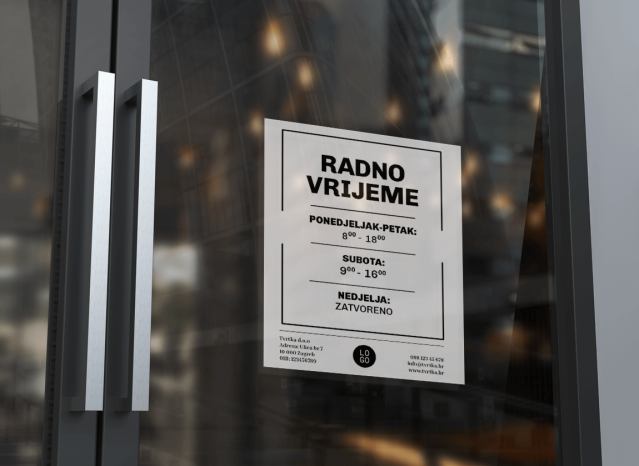 Naljepnica za izlog s prikazom radnog vremena i osnovnih podataka tvrtke ili obrta. Dimenzije naljepnice su cca 150×210 mm (A5 format), a montaža je jednostavna te je možeš obaviti samostalno.
