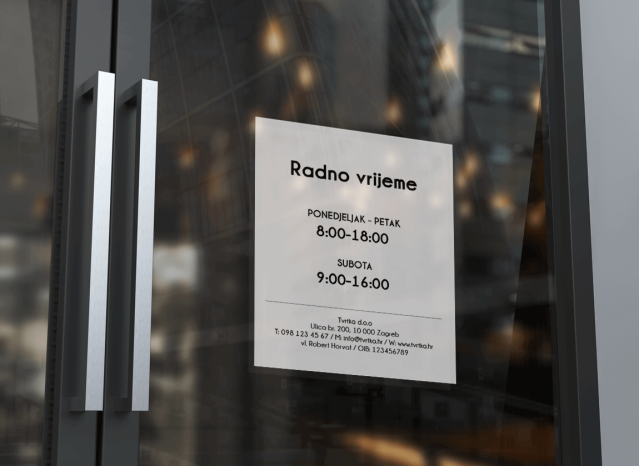 Naljepnica za izlog s prikazom radnog vremena i osnovnih podataka tvrtke ili obrta. Dimenzije naljepnice su cca 150×210 mm (A5 format), a montaža je jednostavna te je možeš obaviti samostalno.