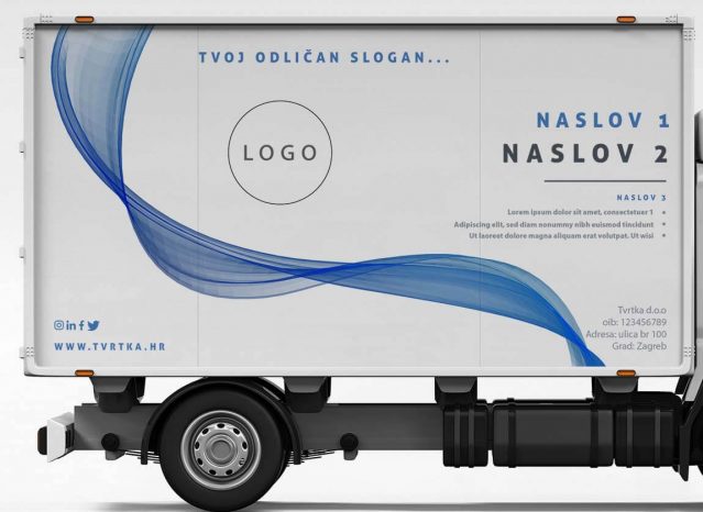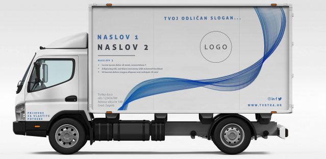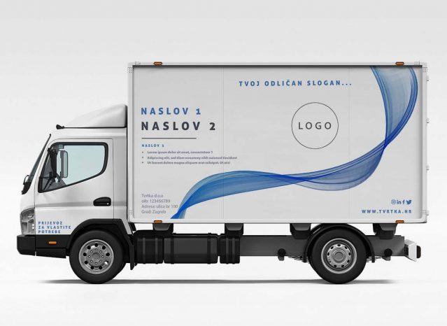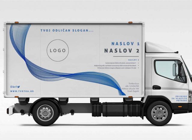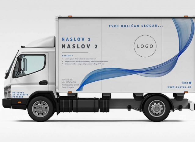 Naljepnice za brendiranje bočnih strana kamiona. U kompletu dolaze naljepnice za lijevu i desnu stranu, a osim za teretni dio, uključene su i naljepnice za vrata kabine “Prijevoz za vlastite potrebe”. Montaža naljepnica za kamion je kompleksna pa predlažemo da istu povjeriš našem stručnom teamu.