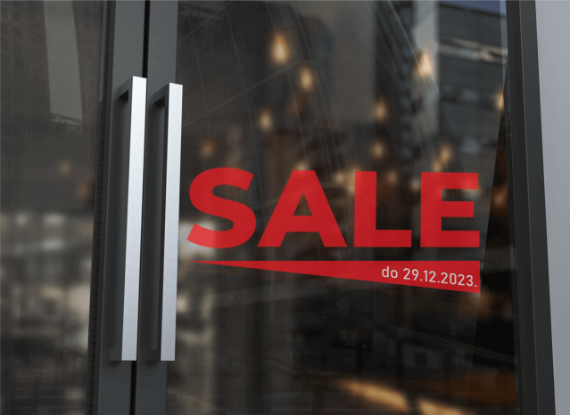 Prikazana grafika je samo primjer, a učitavanjem svojih podataka naljepnicu možeš prilagoditi vlastitim potrebama i time dobivaš personalizirano rješenje za vlastiti izlog.