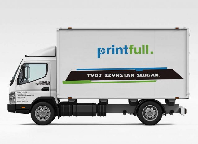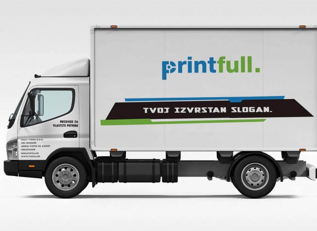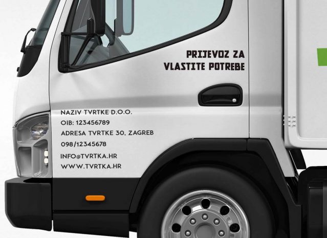 Naljepnice za brendiranje bočnih strana kamiona s logom, sloganom i osnovnim podacima trvkre te napomenom “Prijevoz za vlastite potrebe”. U kompletu dolaze naljepnice za lijevu i desnu stranu. Montaža ovih naljepnica je jednostavna i možeš je obaviti samostalno, a tu su i naše dodatne usluge montaže na vozilo.