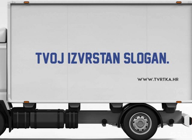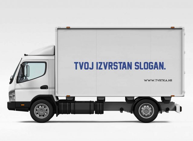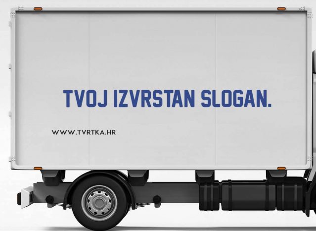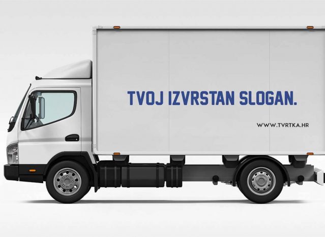 Naljepnice za brendiranje bočnih strana kamiona s prikazom slogana i web adrese. U kompletu dolaze naljepnice za lijevu i desnu stranu, Montaža ovih naljepnica je jednostavna i možeš je obaviti samostalno, a tu su i naše dodatne usluge montaže na vozilo.