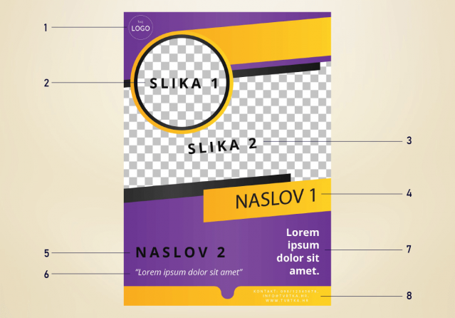 Info plakat s geometrijskom pozadinom. Dolazi u standardnim “A” i “B” formatima te kao banner dimenzija 130×90 ili 130×200 cm.